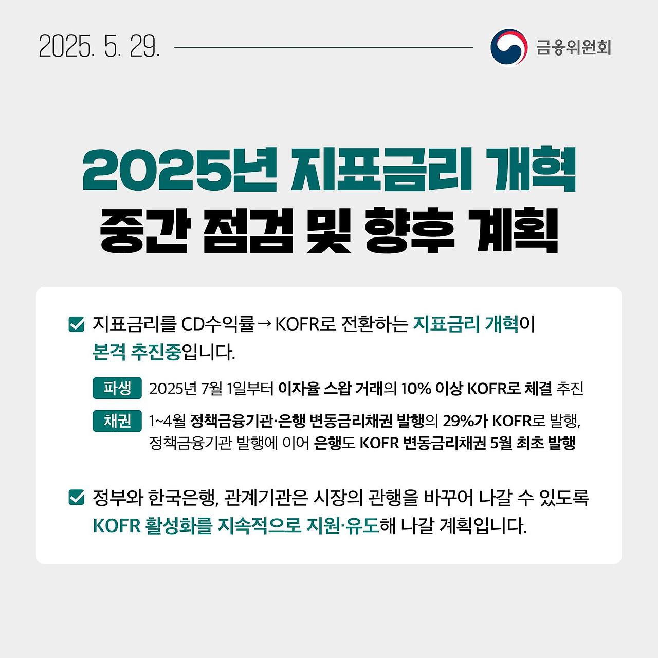 KOFR는 2025년 7월부터 파생상품 시장에 순차 적용되며, 회계부정 신고제도는 이미 활성화되어 운영 중입니다. 상호금융정책협의회도 정기적으로 개최되어 지속적인 개선이 이뤄지고 있습니다.